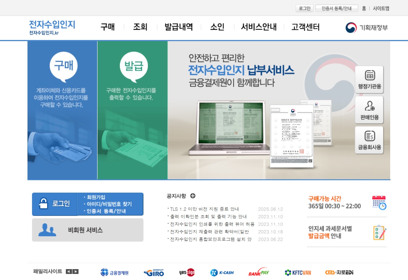 정부24, 홈택스에서는 발급 불가합니다. - 실물 인지는 우체국이나 일부 은행 창구에서 현금으로 구매 가능합니다.